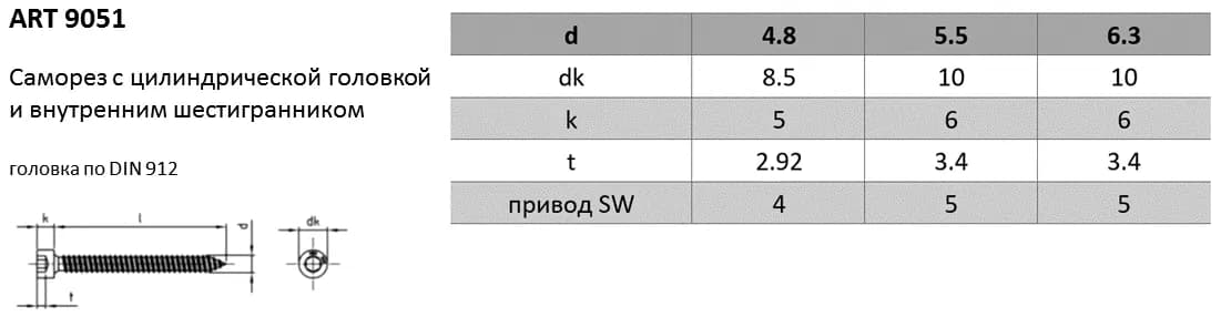 Саморез d6.3х32, ART 9051 с цилиндрической головкой и внутренним шестигранником, нержавеющая сталь А2